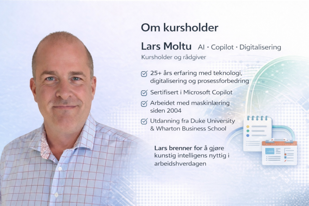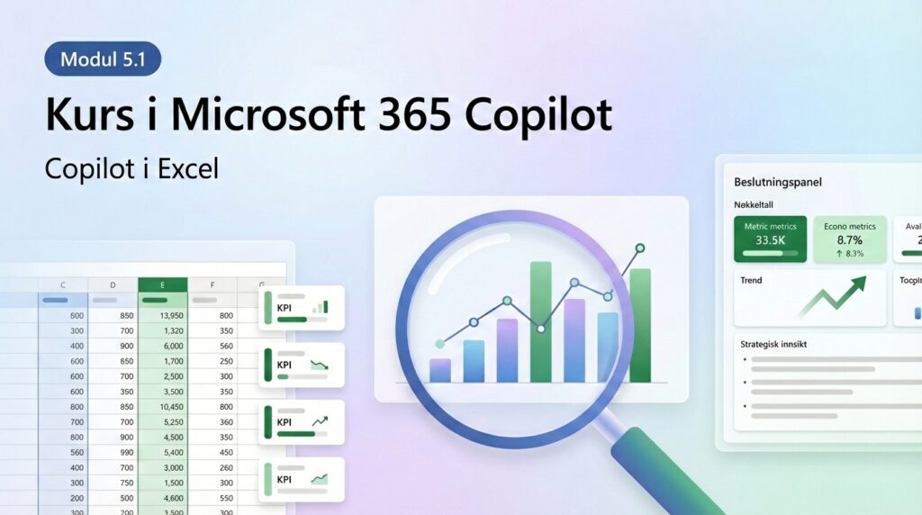 Kurset er utviklet for ansatte og ledere som ønsker å bruke Copilot mer effektivt i Word, Excel, Outlook og Teams.